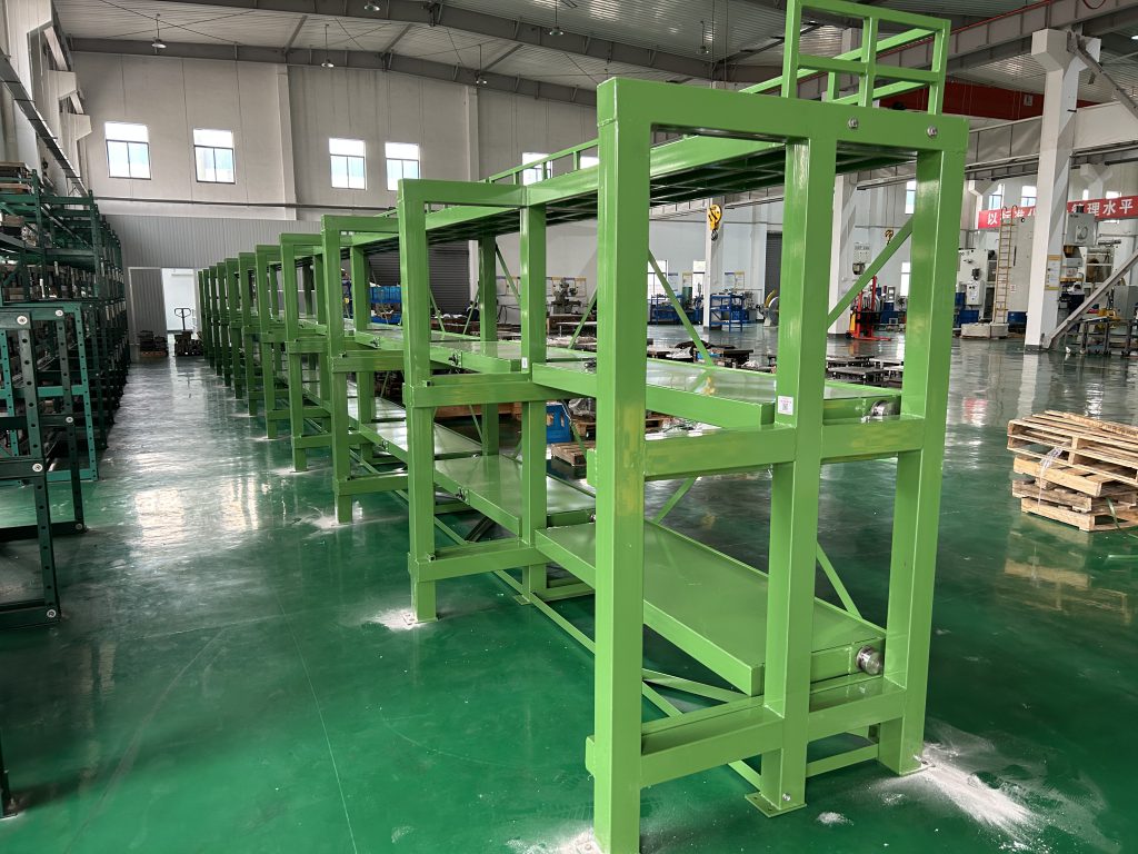 2023年4月12日江蘇海安客戶手搖模具架安裝現(xiàn)場(chǎng),貨架整體需用RAL6010顏色,頂部安裝防護(hù)欄;