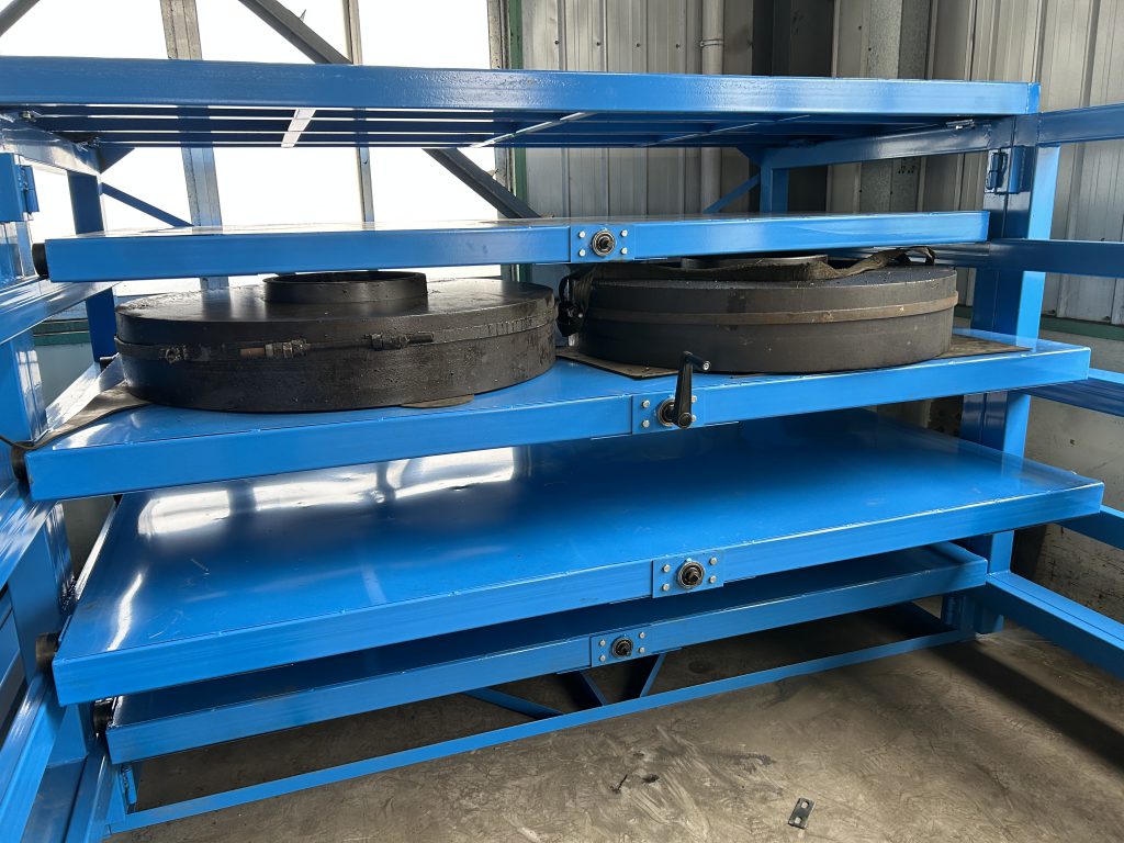 客戶是做廢水處理容器設(shè)備的,手搖模具架放置大型法蘭以及墊片